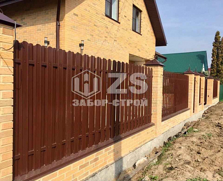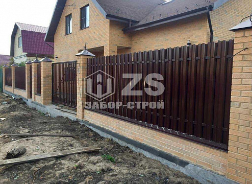 - Забор с кирпичными столбами из евроштакетника 20 метров