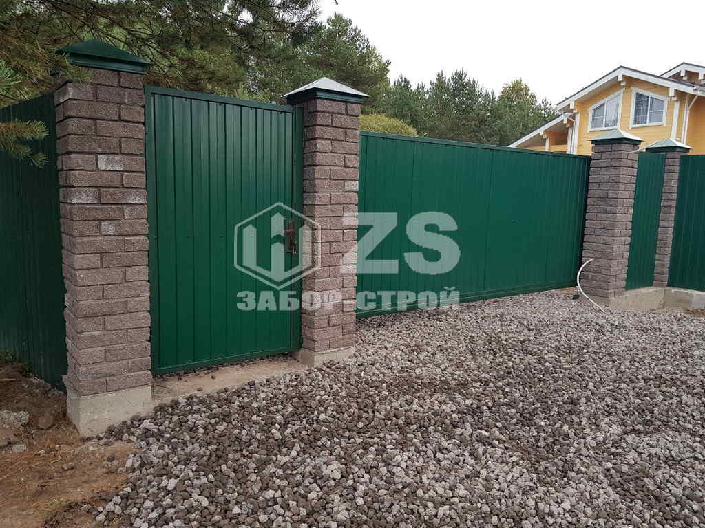 - Забор с кирпичными столбами из профнастила 8 соток
